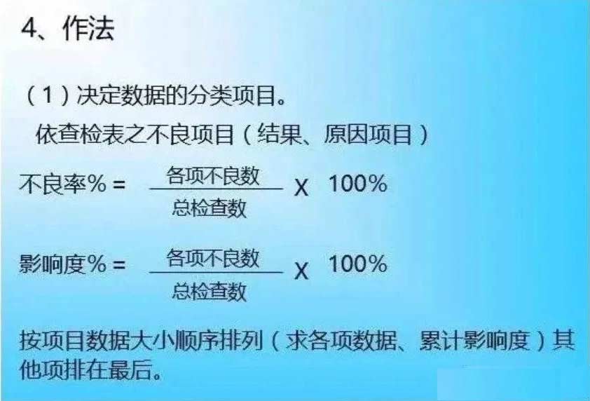 3、特征:(1)以数据为依据分析问题点;(2)掌握全体不良情形;(3)掌握重要不良项目(改善的重点)。