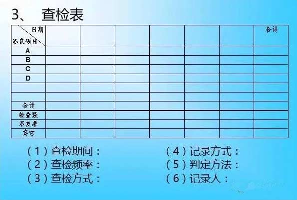1、何谓查检表:在品管圈改善活动,为了便于收集数据与解析判断,而设计的一种表格,查检表。