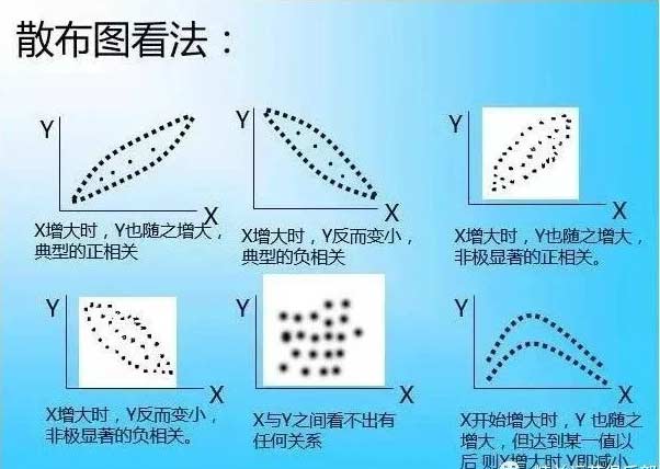 1、何谓散布图:在分析独立数据时,用直方图、柏拉图就可找出改善着眼点,但如要解析两个变量X、Y之间的相关性时,就需使用散布图,将X与Y的两组数据绘在方格纸上,可看出X、Y之间相关情形的图谓之散布图。