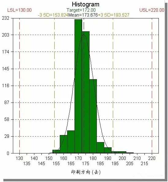 下图是锡膏厚度的直方图,上下限分别是130和220。由图可直接看出数据分布在150~200内,而170~180间的数据最多。