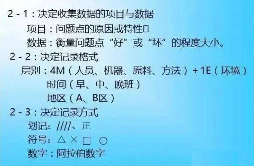 发现原因:从结果到原因,可查出结果如:不良项目别、场所别、工程别,原因如:原料别、机械别、方法别人为别。