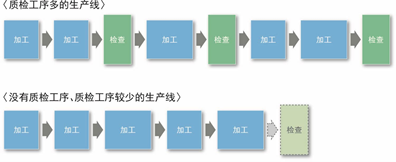 不良品的产生等问题会让企业增加质检工序。如果不究明问题的根源,就会让质检工序残留下来。理想状态是,查明不良品产生的原因,停止质检工序。