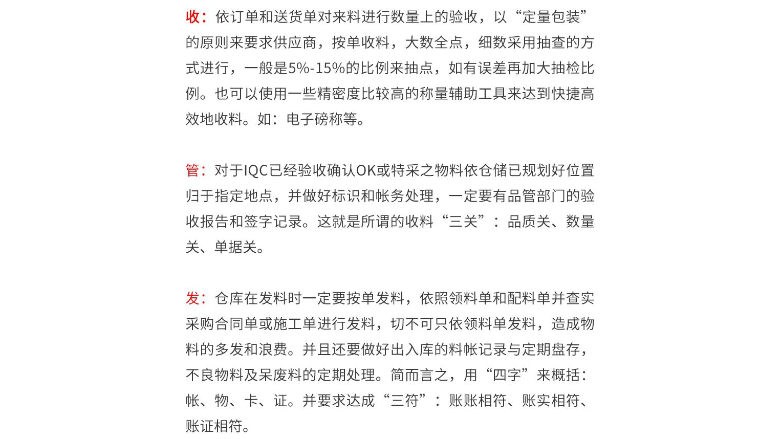 对于仓库的主要工作职责可用“三字”来概括:“收”、“管”、“发”。
