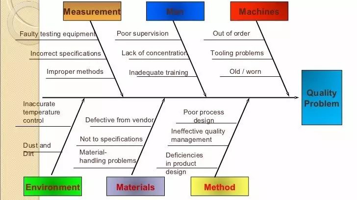 举例:1.发现地上的机油;2.定性为人机料法环中的“机器”问题;3.机器有问题的原因是不是使用“人”操作不当?“法”操作标准未建立?“环”环境有影响?一一排除后都不是,而是“机”本身假冒产品;4.假“机”的原因是买的“人”有问题;5.为什么“人”有问题呢?6.是没有监督的“法”?