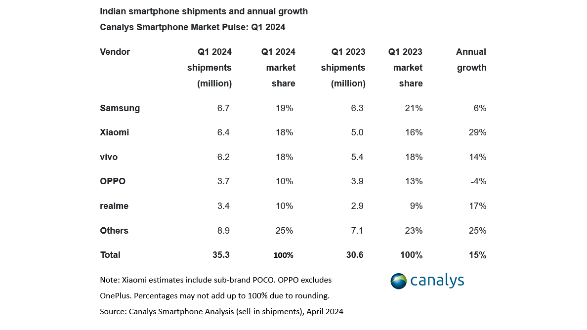 2024年Q1印度智能手机市场大爆发:三星、小米领衔增长,OPPO遇冷,realme与vivo势头强劲