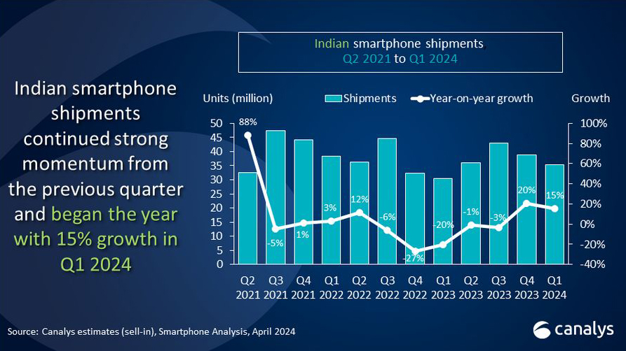 根据Canalys近日发布的报告,2024年第一季度印度智能手机市场呈现出强劲的增长势头。整体来看,市场出货量达到了3530万台,同比增长15%。这主要得益于厂商库存状况的改善以及渠道承接多款新品的推出。在经历了2023年第一季度的出货量低谷、市场面临通胀压力、需求疲软和库存问题后,印度智能手机市场在2024年第一季度实现了显著的复苏。