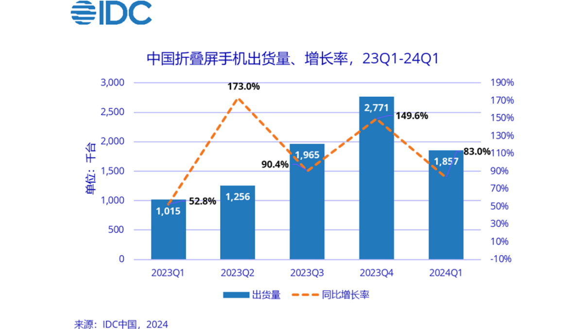 4月25日消息,国际数据公司(IDC)今日公布了2024年第一季度中国手机市场的详细报告,其中折叠屏手机市场继续保持迅猛增长态势,出货量激增至186万台,同比去年一季度飙升了83%。