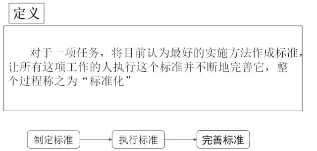 标准化是作出规定,遵守而且改善这个规定,不停地进行改善——遵守——再改善的活动才可称为标准化。