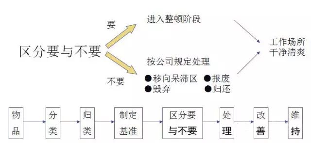 整理:区别需要与不需要,不需要的坚决不要。整顿:需要的物品排成有序状态。