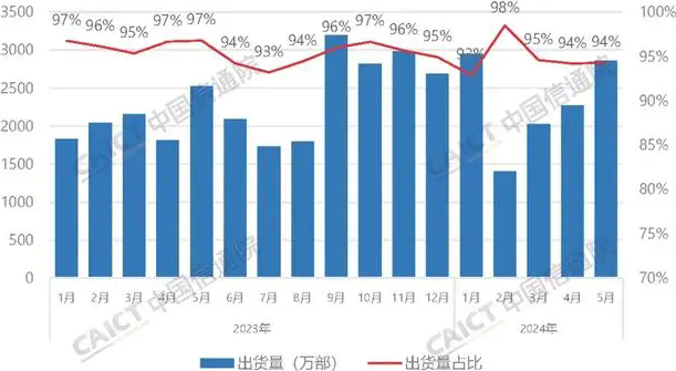 2024年5月,智能手机出货量2860.0万部,同比增长13.5%,占同期手机出货量的94.3%;智能手机上市新机型37款,同比增长37.0%,占同期手机上市新机型数量的75.5%。