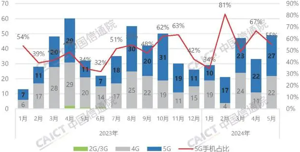 2024年5月,国内手机上市新机型49款,同比增长53.1%,其中5G手机27款,同比增长145.5%,占同期手机上市新机型数量的55.1%。