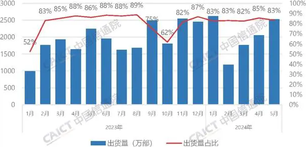 2024年1-5月,国内市场手机出货量1.22亿部,同比增长13.3%,其中,5G手机1.02亿部,同比增长20.3%,占同期手机出货量的83.9%。