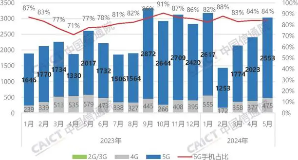 2024年5月,国内市场手机出货量3032.9万部,同比增长16.5%,其中,5G手机2553.1万部,同比增长26.6%,占同期手机出货量的84.2%。