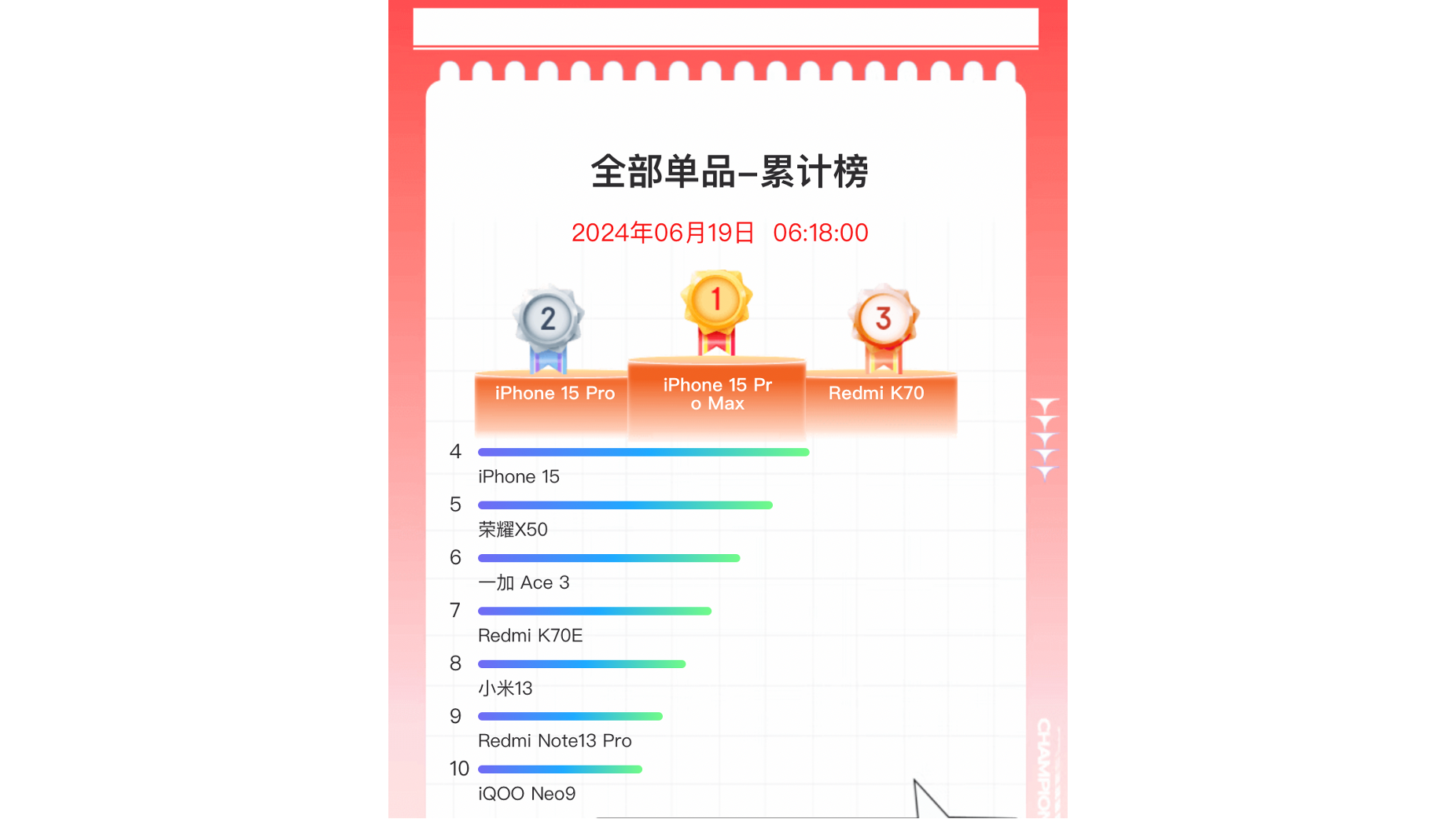 本届618最大的惊喜是,Redmi K70挤进了竞速榜前三名,改变了往年竞速榜上苹果独占前三的局面。据了解,这同样也与Redmi K70激进的降价策略脱不开干系。在大促期间,Redmi K70价格曾一度跌至1799元(12+256GB版本发售价为2499元)。