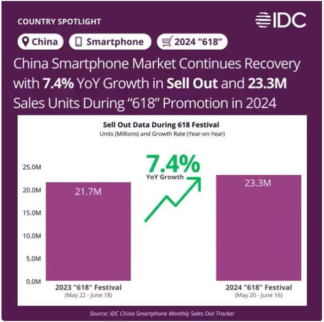 IDC:今年618中国智能手机销量同比增长7.4%达到2330万台