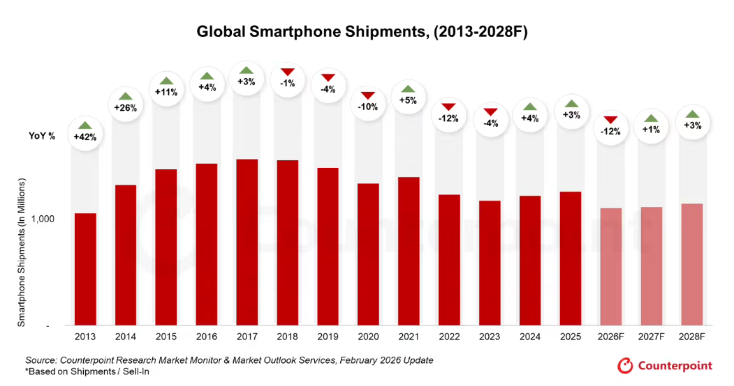 2 月 28 日消息,Counterpoint Research 昨日表示,2026 年的智能手机市场恐出现历史最严重的收缩,出货规模跌破 11 亿件,同比大减 12.4%,创下 2013 年后的新低。